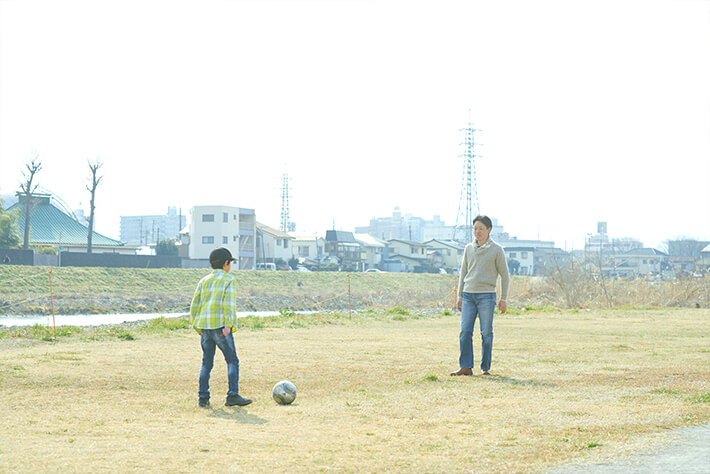 自宅近くの河原で、息子さんと愛犬と一緒に休日の一時を楽しまれる梅原さん。